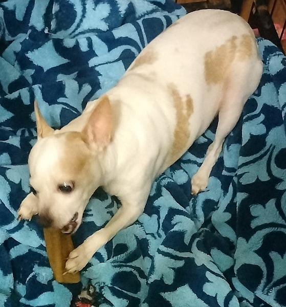Positives: Sadie is between 8 and 10 years of age, spayed, current on vaccines, microchipped, heartworm negative and on prevention. She gets along with dogs both large and small. Not sure about cats. Sadie does not "bark" when people knock on the door. We have never heard her bark in 6 months. A strong whine when she needs to go out is the most noise she has made. She loves to sleep under covers with her person if allowed. Otherwise she likes a crate with blankets. Negatives:1. NO SMALL children. While Sadie loves people she is reactive if held too tight and may bite. This may put a small child not understanding her past at risk. 2. She MUST be leash walked for potty breaks - she will chase anything that runs (cats, squirrels, birds, etc). Currently Sadie is on a schedule of going out 4 times a day. She will complete her 'business' in under 10 minutes and hurry back inside. Sadie is not a fan of the outdoors. She will use a wee-pad if taught where it is. 3. Sadie is afraid of feet, brooms, newspapers, and loud noises (raised voices). If interested in Sadie please fill out an Adoption Aapplication form. Keep in mind we will be very careful with her placement.